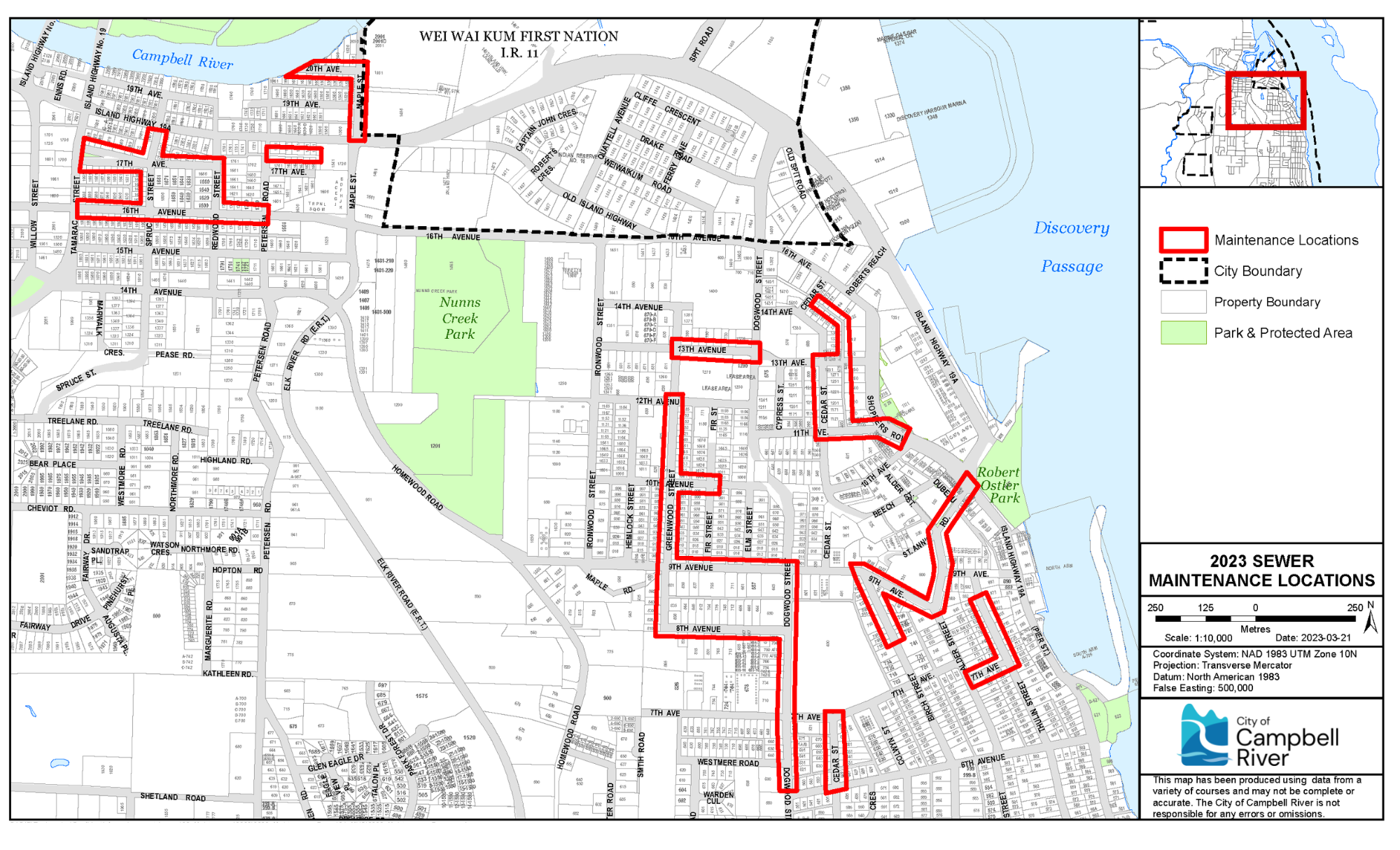 The City of Campbell River is completing annual maintenance and inspection of downtown sewer mains from Friday, March 24, to April 25, 2023. Work will take place Mondays through Saturdays, between 7 a.m. and 7 p.m. and will occur downtown and in Campbellton. The attached map provides location details.