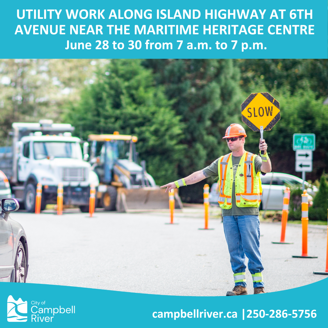 Please be advised that utility work will take place along the Island Highway at 6th Avenue, near the Maritime Heritage Centre, beginning Wednesday, June 28 and running until Friday, June 30, 2023. Work will take place from 7 a.m. to 7 p.m. daily.