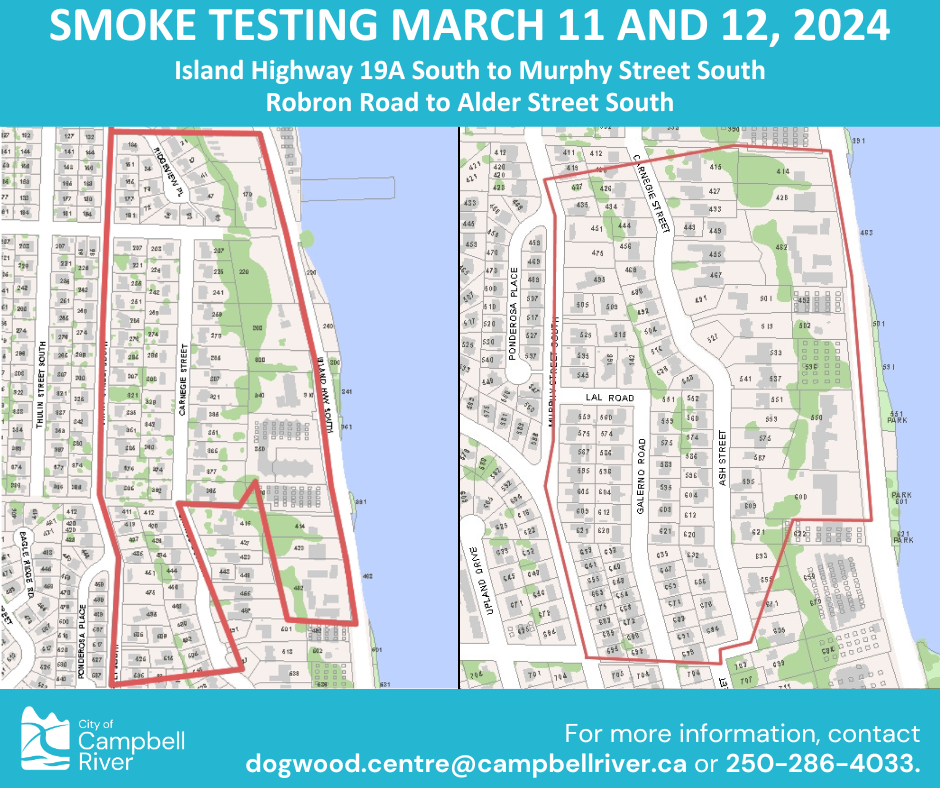 City of Campbell River (City) crews will be smoke testing sanitary sewer systems between Island Highway 19A South and Murphy Street South, and from Robron Road to Alder Street South, on Monday and Tuesday, March 11 and 12, 2024. We have provided information directly to areas affected by this work.